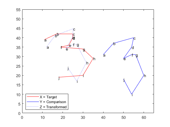 plot(X(:,1), X(:,2),'r-', Y(:,1), Y(:,2),'b-',... Z(:,1),Z(:,2),'b:'); text(X(:,1), X(:,2),('abcdefghij')') text(Y(:,1), Y(:,2),('abcdefghij')') text(Z(:,1), Z(:,2),('abcdefghij')') legend('X = Target','Y = Comparison',... 'Z = Transformed','location','SW') xlim([0 65]); ylim([0 55]);